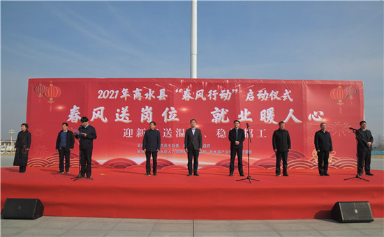 春風送崗位,就業(yè)暖人心。春節(jié)假期剛過,2月18日,商水縣舉行2021年“春風行動”啟動儀式暨企業(yè)春季用工招聘會,為企業(yè)和求職者搭建一個雙向溝通交流的平臺,讓用人單位挑選到適合企業(yè)發(fā)展的人才,也讓求職者在家門口找到適合自己的就業(yè)崗位。縣委書記孔陽,縣長田林,縣人大常委會主任李德來,縣政協主席孫培忠,副縣長朱高建,縣政協副主席、工商聯主席彭發(fā)光,縣工會主席盧紅兵,縣集聚區(qū)管委會主任馬三華等出席啟動儀式。啟動儀式由朱高建主持。