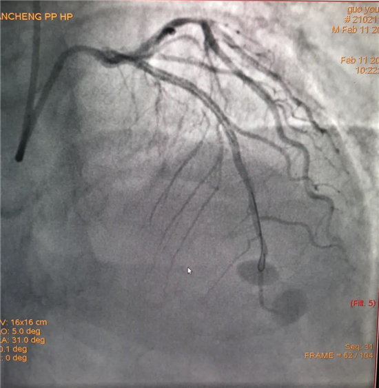 除夕,郭先生無明顯誘因突發胸痛,120急救人員到達現場,心電圖顯示:竇性心律完全性束支傳導阻滯。信息立刻發送到胸痛中心介入微信群中,心內科值班醫生初步診斷為急性廣泛前壁心肌梗死,必須盡快進行急診支架治療,開通血管。值班醫生電話指導院前治療,并立即啟動胸痛綠色通道,24小時備班的介入治療團隊立即到位,9:30患者被送到導管室行冠脈介入診療,9:40急診PCI手術隨之開始,冠脈造影檢查提示左前降支閉塞,植入支架,堵塞的血管被順利打通,患者癥狀緩解,手術非常成功,10:20患者被送往病房進一步治療。