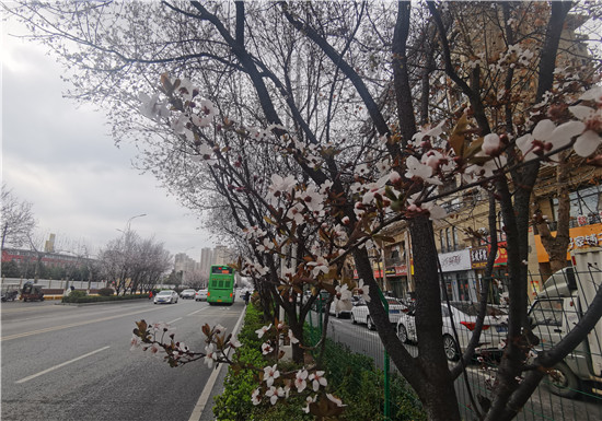 3月1日,慶豐街道兩邊的紫葉李花開似雪,紫葉李貫穿整個慶豐街,形成了一道靚麗的風景。盛開的紫葉李花瓣兒呈白色或粉色,微風拂過,花瓣兒飄散在空中,為過往的車輛下起了晴天里的花瓣雨。