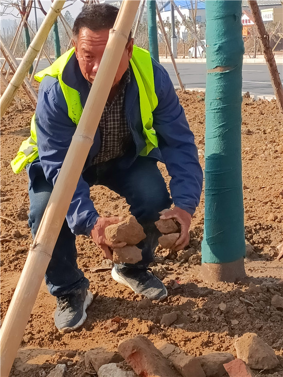 中州大道太清路至周口野生動物世界段主體工程基本完工,目前正在進行輔助工程的施工。圖為3月4日,幾名工人正在進行車道隔離帶和邊道景觀帶的平整綠化。③6
