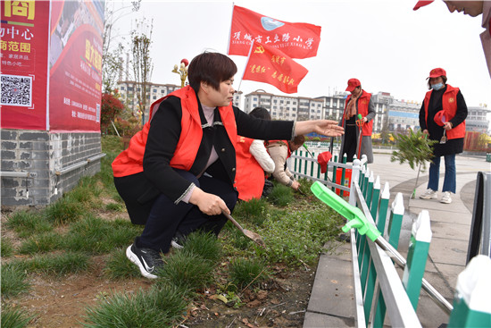 在項城市中心廣場,項城市工業路小學“黨旗紅”志愿服務隊的志愿者對綠化帶中的雜草進行清理,裸露的花草重新種植。用實際行動踐行“綠水青山就是金山銀山”的發展理念。