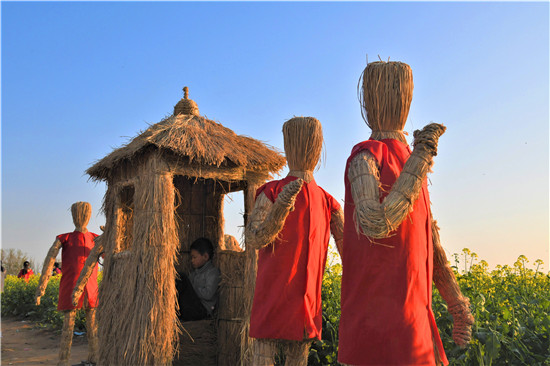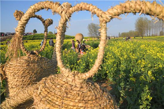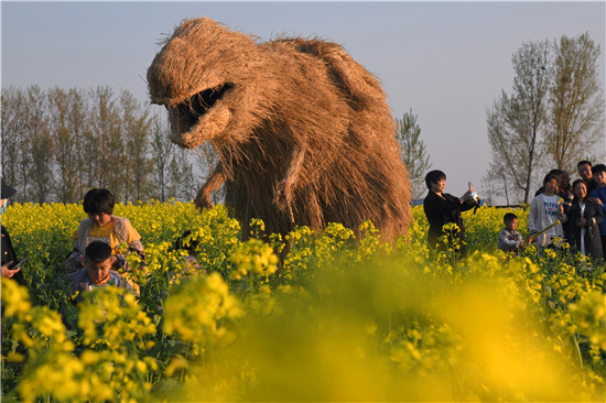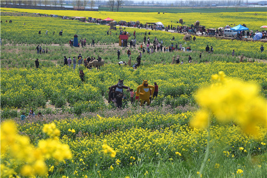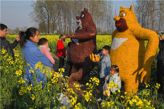 4月5日上午,在商水縣鄧城鎮沙潁河畔萬畝油菜花海,來自周邊縣市區和附近鄉鎮的群眾一撥接一撥地駕車到這兒打卡游玩,特別是卡通稻草人景點內熱鬧非凡。