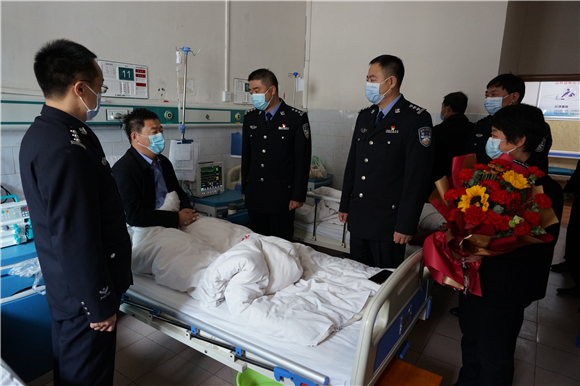 4月9日上午,項城市副市長、公安局黨委書記、局長萬東偉同志專程前往項城市第一人民醫院,看望慰問累倒在工作崗位上的刑偵大隊民警李書金,為其送去鮮花和慰問金。局黨委副書記、副局長陳重,黨委委員、副局長張勛峰,黨委委員王濟嶺、衛偉等陪同慰問。