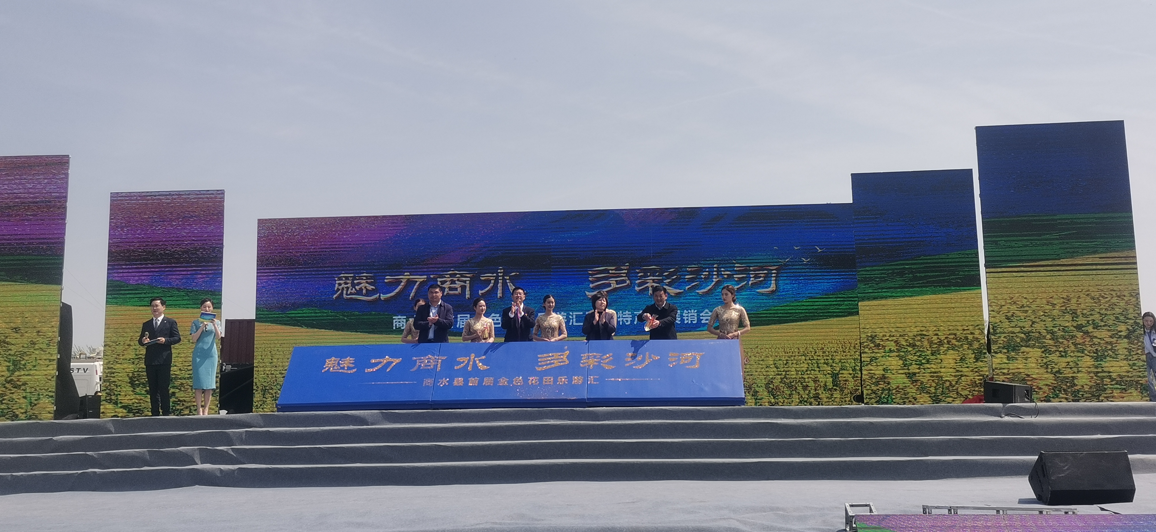在開幕式上,歡歌熱舞熱情奔放,驚險(xiǎn)雜 技技驚四座,唐俑表演俏皮可愛,一個(gè)個(gè)精彩演出引得游客們掌聲、歡呼聲不斷。一旁的農(nóng)副產(chǎn)品展銷臺(tái)前,鄧城豬蹄、白寺草莓等農(nóng)特產(chǎn)品更是引得游客爭相購買。同時(shí),現(xiàn)場還進(jìn)行了首屆魅力商水多彩沙河金色花田樂游匯首日封發(fā)行儀式,以作開幕紀(jì)念。