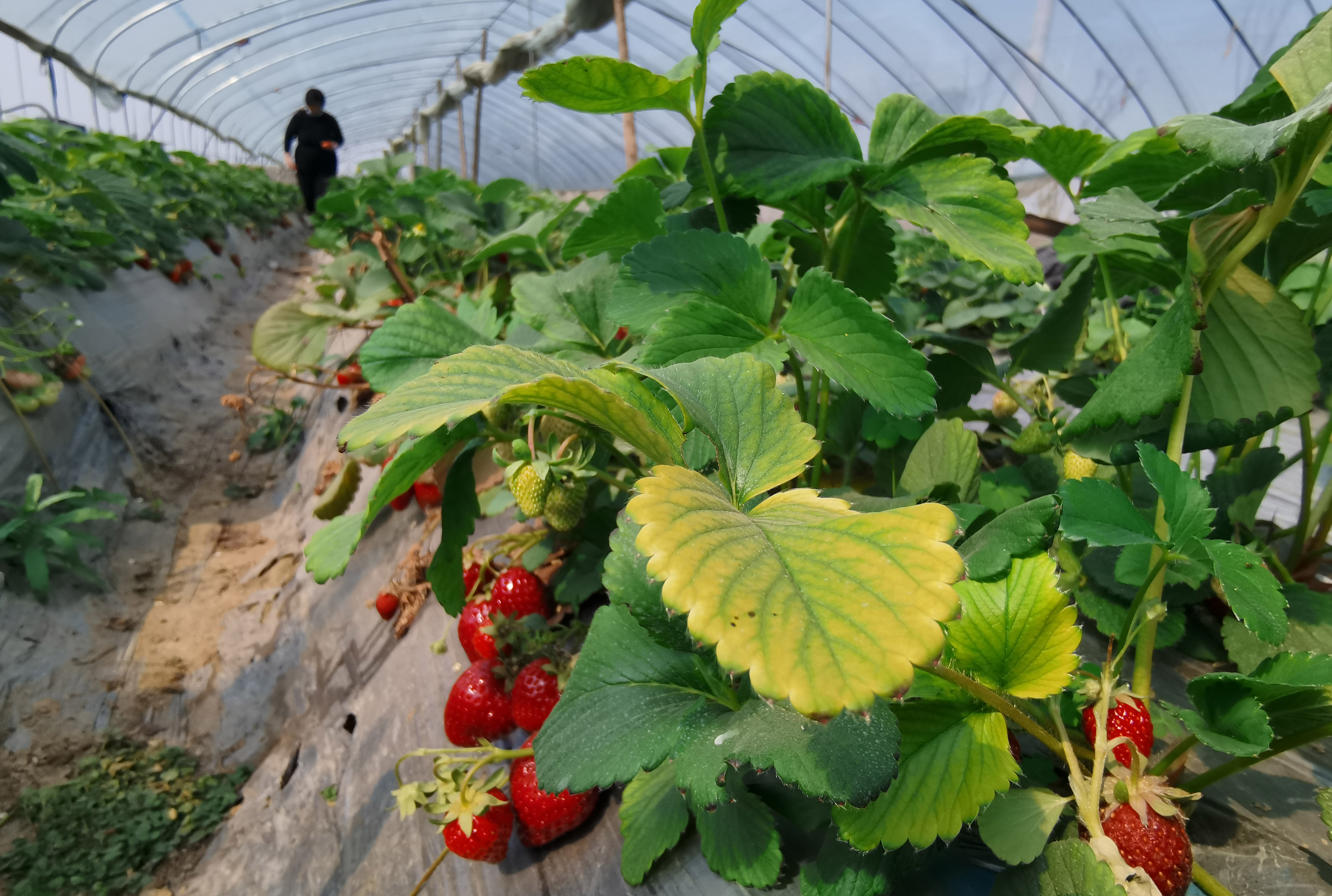 4月14日,商水縣八一大道南段城關鄉的草莓大棚和花卉大棚連成片。在草莓種植大棚內,紅彤彤的草莓吸引了不少游客前來采摘。商水縣城關鄉不少農民結合所處地域優勢,發展種植草莓、花卉等經濟作物,吸引不少縣城及周口市區的市民來此采摘,促農民增收。②9