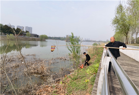 4月16日,周口植物園管理人員及保潔人員在打撈漂浮在湖水中的垃圾及枯草。為了給市民提供一個干凈、優美的園內環境,植物園的工作人員每天都會清理打撈湖水中的雜物。