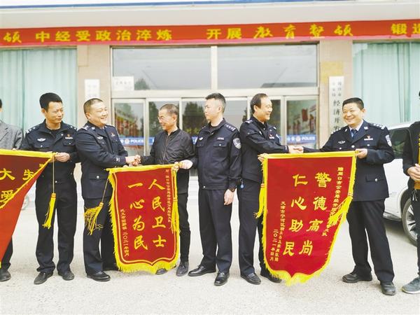 “幾天前,當(dāng)警方通知我妹妹在河南周口找到時,我們?nèi)叶己芗樱嫘母兄x周口的警察同志,你們辛苦了!”胡某某的哥哥向經(jīng)濟(jì)開發(fā)區(qū)公安分局民警深深鞠躬致謝,并將一面寫有“警德高尚 仁心助民”的錦旗送到經(jīng)濟(jì)開發(fā)區(qū)公安分局副局長張國華、刑偵大隊負(fù)責(zé)人宋東營手中(如圖)。