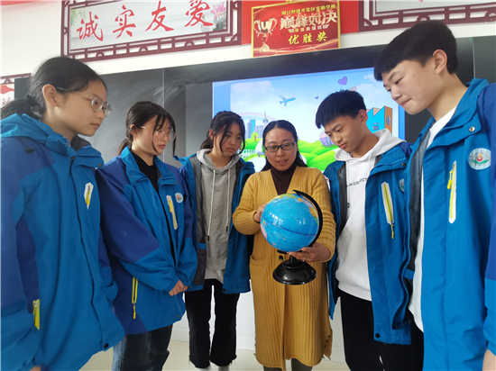 周口經(jīng)濟(jì)開發(fā)區(qū)實(shí)驗(yàn)學(xué)校教師為學(xué)生講解地球結(jié)構(gòu)知識(shí)。