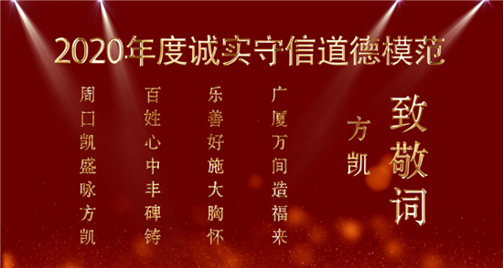 “廣廈萬間造福來,樂善好施大胸懷;百姓心中豐碑筑,周口凱盛詠方凱?!被顒?dòng)組委會(huì)在授予方凱的致敬詞中這樣說道。