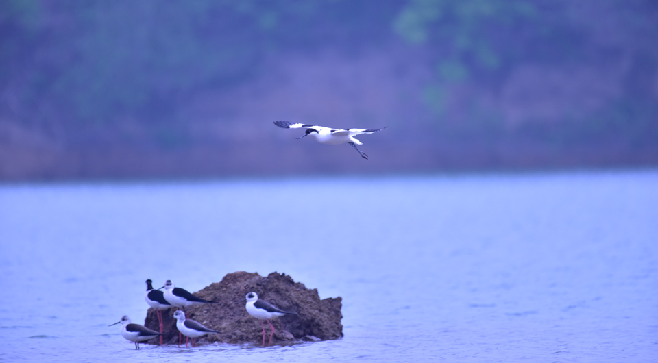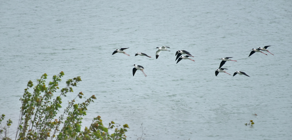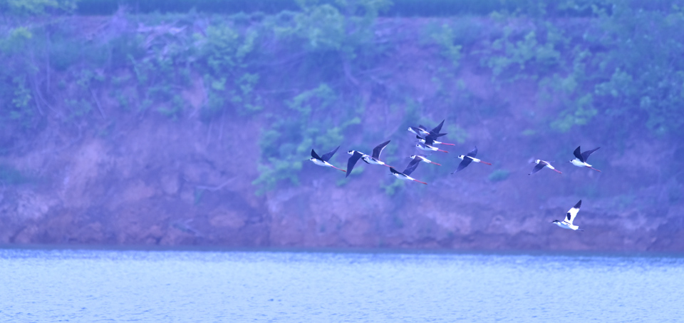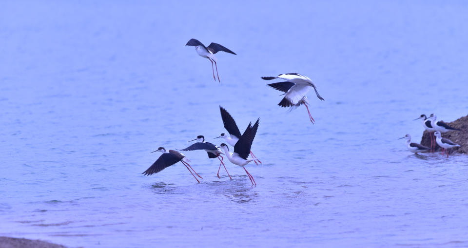 記者發現,這一群鳥約有20只,大紅的長腿,尖尖的黑嘴,黑翅長腳鷸身著潔白羽衣,時而在水邊優雅踱步,時而凌空飛翔,姿態優雅,氣質非凡。