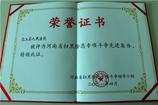 沈丘法院榮獲“河南省掃黑除惡專項斗爭先進集體”稱號