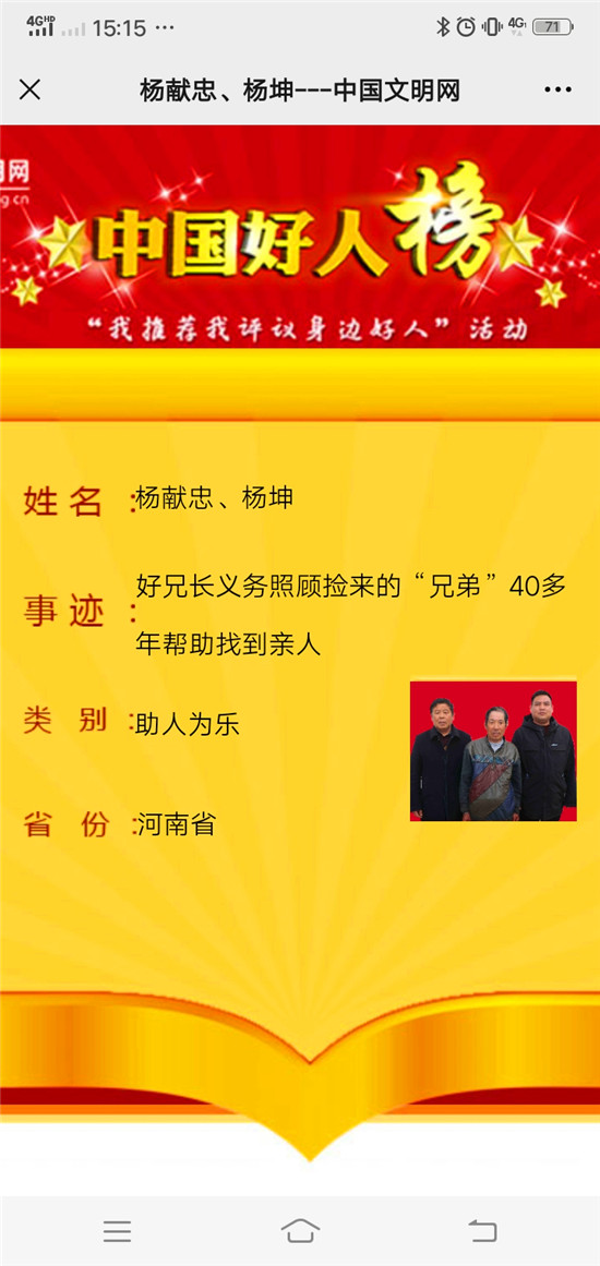 楊獻忠,太康縣老冢鎮孟莊行政村村民;楊獻忠的兒子楊坤,目前任太康縣王集鄉綜合執法隊主任。40多年前,楊獻忠撿來一個“弟弟”楊留用并對其義務照顧。在楊獻忠和兒子楊坤的不懈努力下,楊留用終于找到了親人。4月29日,中國文明網公布2021年3月“中國好人”上榜名單,楊獻忠、楊坤父子名列其中。