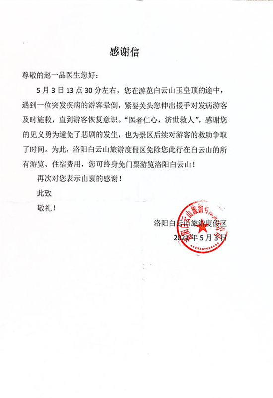 得知趙醫生見義勇為的事跡后,洛陽白云山旅游度假區對趙一品醫生送出了感謝信,免除他此行在白云山的所有游覽、住宿費用,并可終身免門票游覽洛陽白云山。