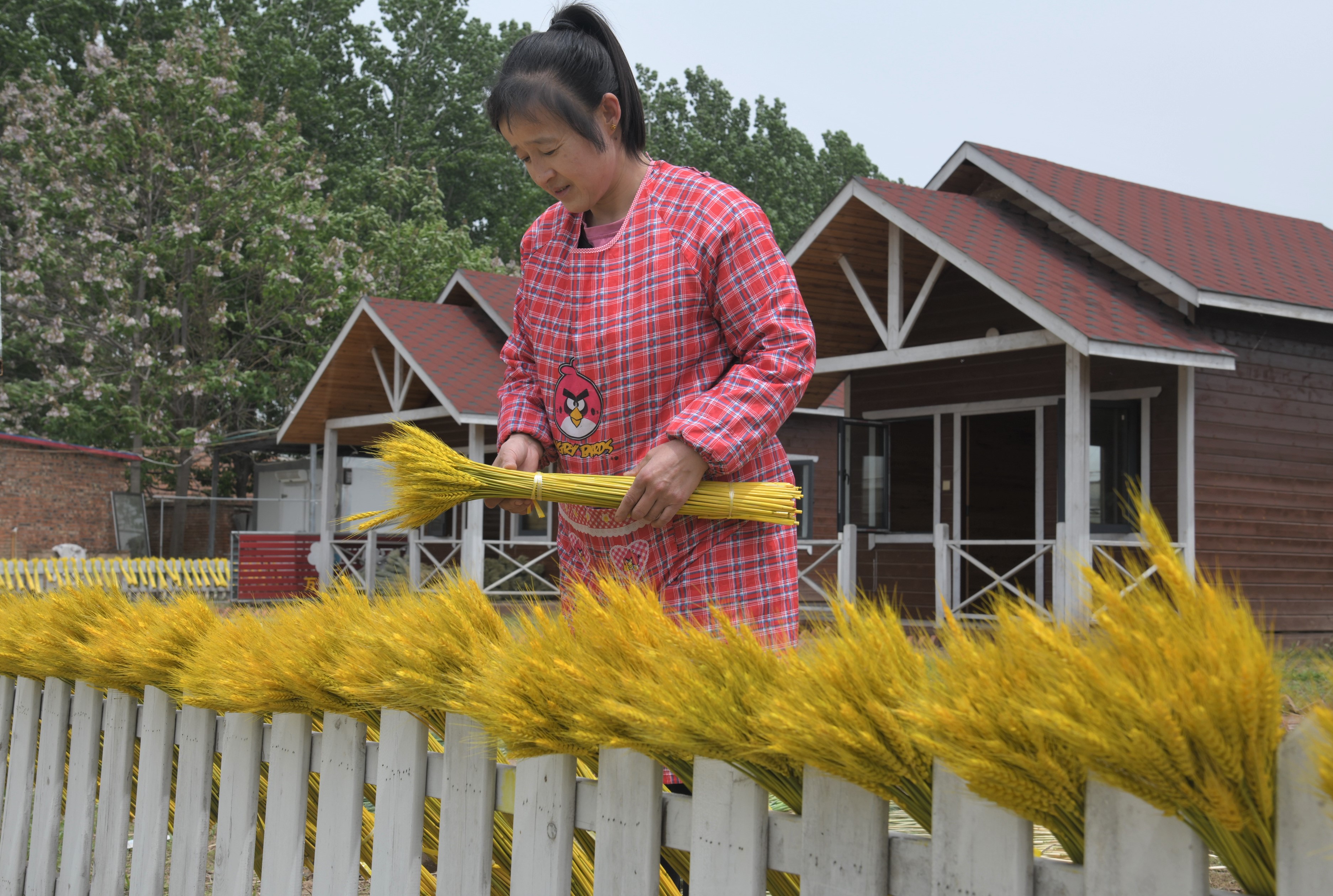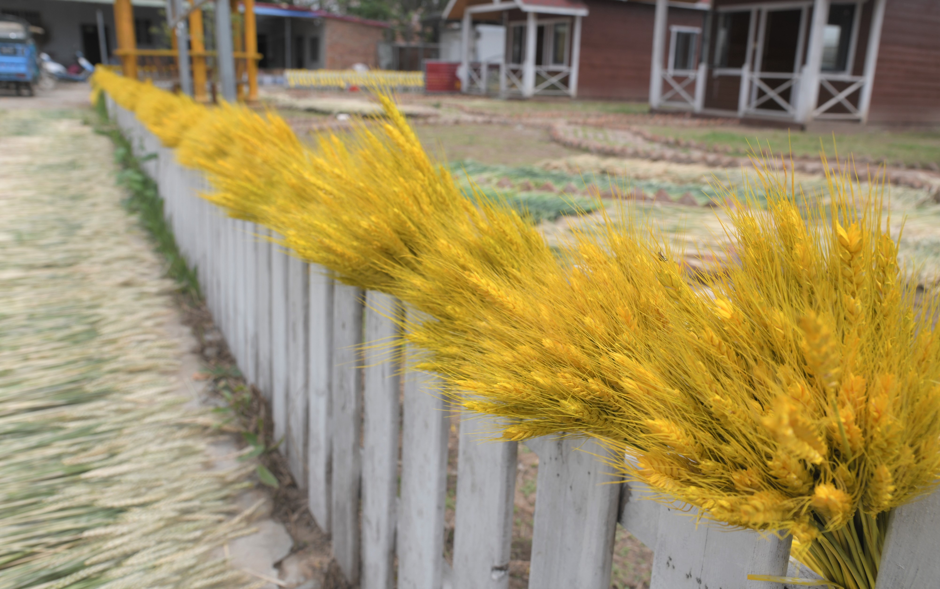 5月7日,商水縣平店鄉雒莊村民正在察看晾曬中的彩色麥秸稈。該鄉村民李東洋今年種植大麥10多畝,在灌漿之初提前收割晾曬,并把麥稈染成黃、藍等不同顏色,用于大中城市的商超裝飾,由于大麥和“大賣”諧音,許多商家非常喜歡,產品供不應求,產值也翻了幾番。②8