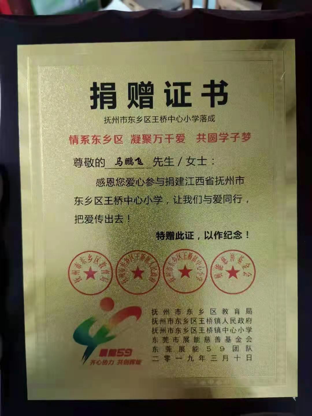 2019年,馬鵬飛出資數萬元,參與捐建了江西省撫州市東鄉區王橋中心小學,凝聚愛心,共圓老區學子夢。3月,撫州市東鄉區教育局、撫州市東鄉區王橋鎮人民政府、王橋鎮中心小學,為馬鵬飛頒發了捐建證書。