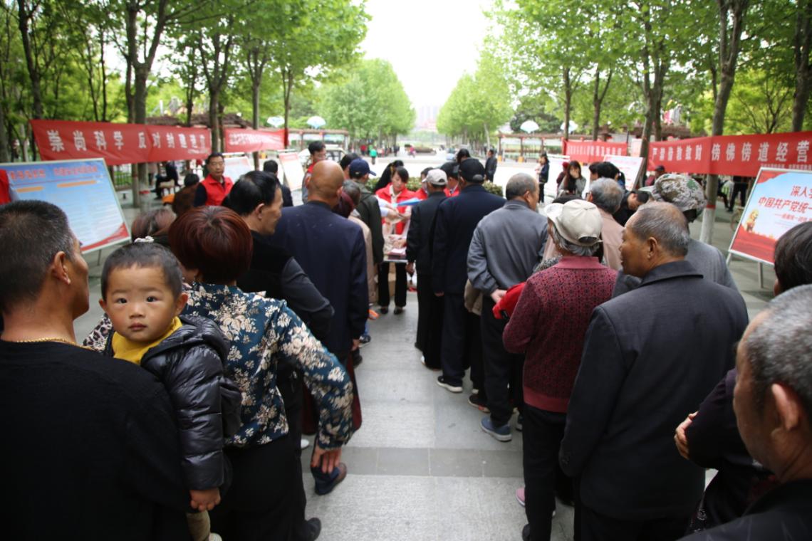活動現場發放了《習近平總書記關于民族工作重要論述選編》《宗教工作政策法規宣傳冊》《宗教事務條例》《河南省宗教事務條例》等宣傳手冊2000余冊,發放宗教政策法規明白卡和民族團結進步宣傳彩頁3000張及印有宣傳標識的手提袋、紙質水杯、圍裙1800套。同時,擺放主題鮮明的宣傳展板30塊,懸掛宣傳標語、橫幅40條,突出活動主題,增強了活動的吸引力,營造了良好的現場宣傳活動氛圍。