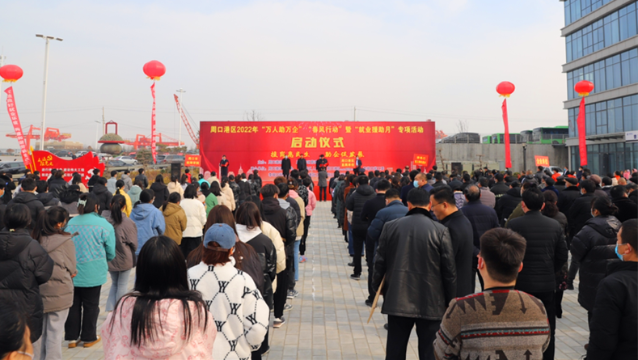 2月22日,周口港區舉辦2022年“萬人助萬企”“春風行動”暨“就業援助月”啟動儀式,通過舉辦一系列活動,為企業和求職者牽線搭橋。港區黨委書記孫鵬宣布啟動儀式開幕,管委會主任胡軍華在儀式上致辭,港區領導杜廣賢、劉學慶、李素芹參加活動。