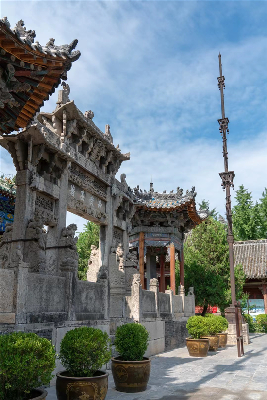 過(guò)山門,突現(xiàn)在眼前的是一對(duì)鐵旗桿。鐵旗桿高22米、重3萬(wàn)余斤,且桿身鑄有銘文圖案、山水花卉、龍鳳鳥獸。