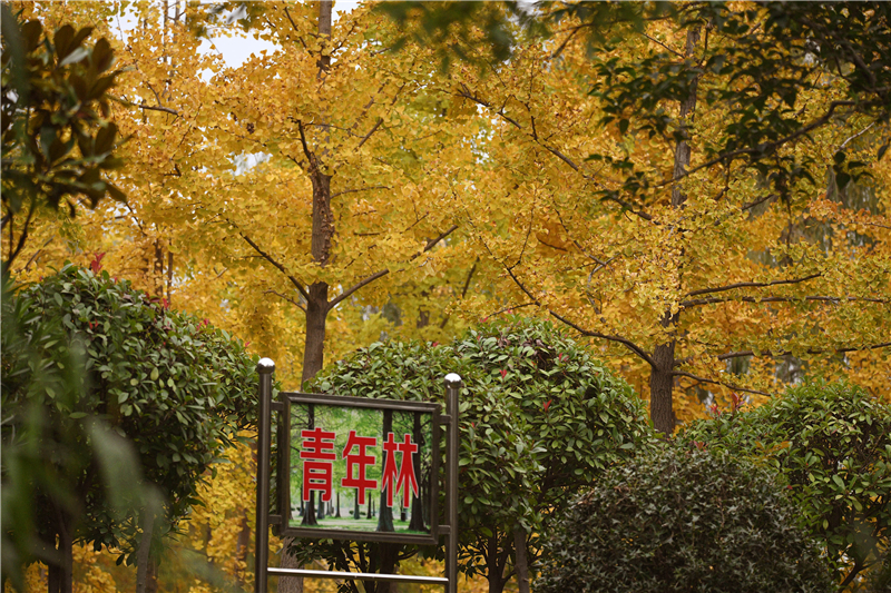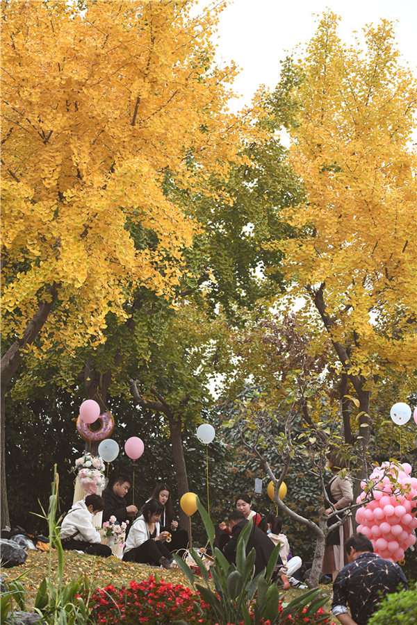 10月31日下午,周口公園的銀杏樹滿樹金黃、披金溢彩,在斑駁的綠樹、紅葉之間,格外美麗,吸引著周末休閑的居民們觀賞游玩。