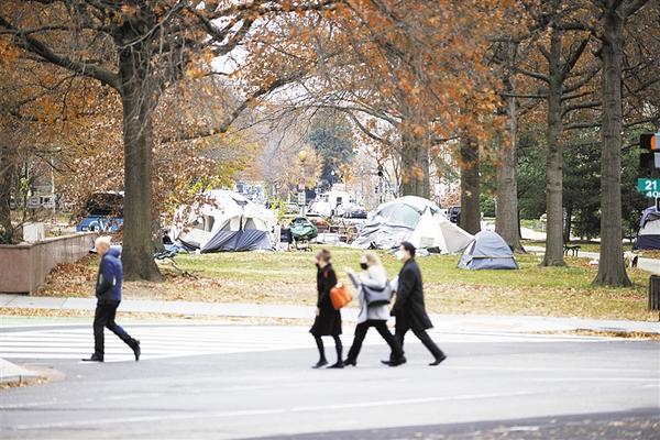 12月8日,在美國華盛頓,行人經(jīng)過無家可歸者居住的帳篷。