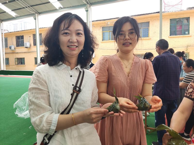 “雖然我平常很少包粽子,但還是挺簡單的?!蔽乃蓮娺呎f邊包,用繩子將粽子纏繞好,用牙咬住繩子的一頭,一手拿粽子,另一手將繩子打結。整個過程一氣呵成,引來不少人前來學習。