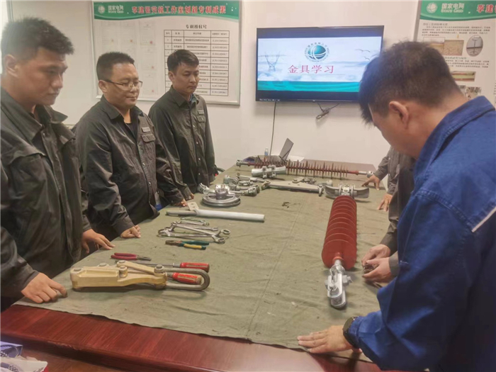 學習中,該公司輸電運維支撐中心五級職員鄧建國向大家講解了常用輸電線路金具的種類及用途,包括絕緣子、懸垂線夾、連接工具的介紹和使用。