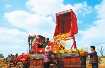 大片大片的玉米隨風(fēng)搖擺,伴隨著隆隆的轟鳴聲,一排排玉米植株被農(nóng)機(jī)收割。“這種大型玉米聯(lián)合收獲機(jī),每臺每天可收獲玉米100畝左右,省時又省力。”農(nóng)機(jī)手趙會濤說。