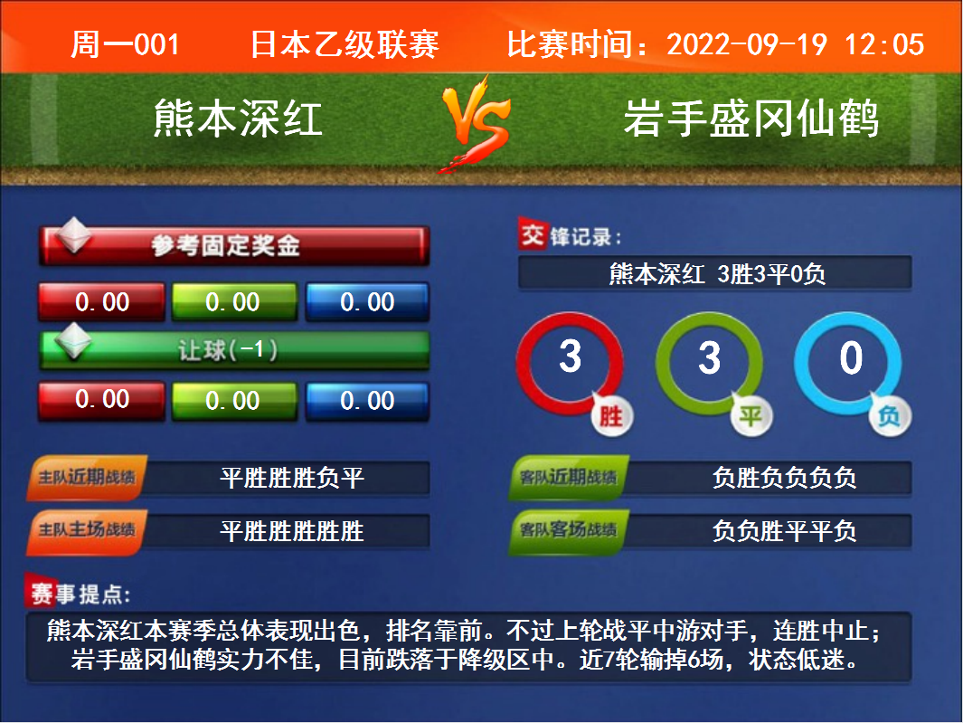 比賽時間:2022-09-19 12:05賽事提點:熊本深紅本賽季總體表現出色,排名靠前。不過上輪戰平中游對手,連勝中止;巖手盛岡仙鶴實力不佳,目前跌落于降級區中。近7輪輸掉6場,狀態低迷。
