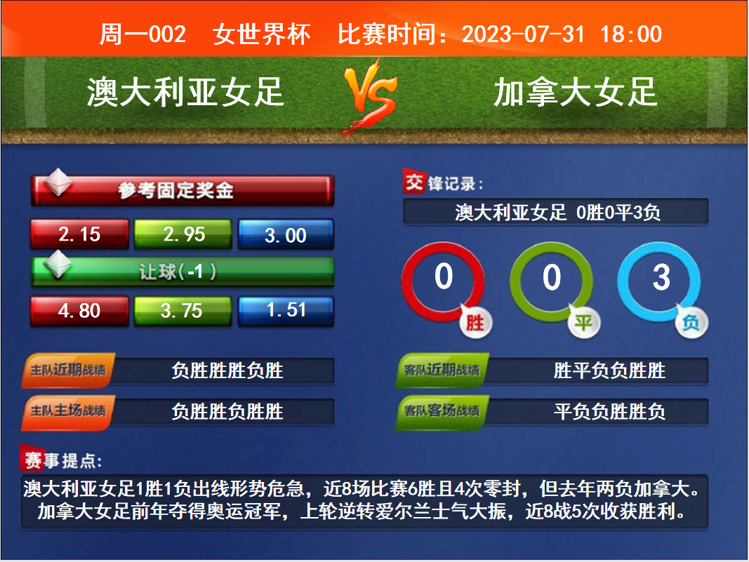 比賽時間:2023-07-31 18:00賽事提點:澳大利亞女足1勝1負出線形勢危急,近8場比賽6勝且4次零封,但去年兩負加拿大。加拿大女足前年奪得奧運冠軍,上輪逆轉愛爾蘭士氣大振,近8戰(zhàn)5次收獲勝利。