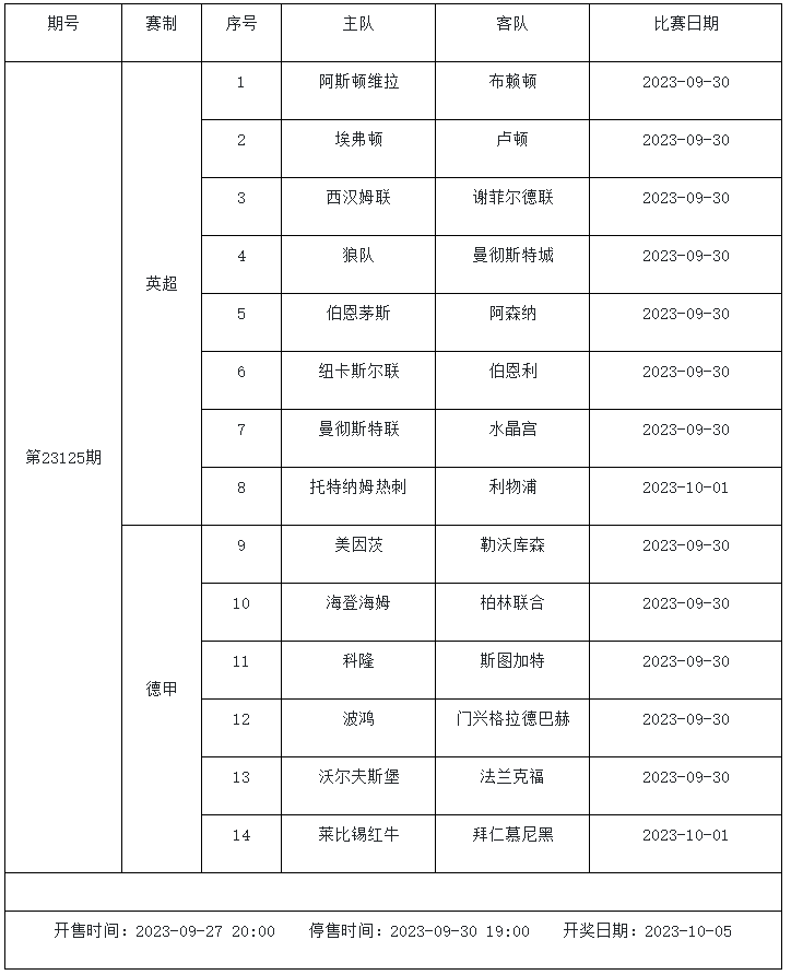 萊比錫周中德國杯3:2擊敗韋恩,各項賽事取得6連勝,出色的防守能力是萊比錫在今夏大失血之后依舊能保持競爭力的關鍵。在德甲賽季初的5場比賽里萊比錫打進14球僅失4球,是目前德甲失球最少的球隊之一,以亨利西斯+西馬坎+盧科巴+勞姆的后防組合功不可沒。拜仁上輪聯賽7:0血洗波鴻,凱恩上演帽子戲法,目前打進7球排在德甲射手榜第2的位置。目前隊內主力前腰穆西亞拉因傷無法出戰,舒波莫廷替代他的位置,和科曼、薩內以及凱恩梳理球隊攻擊線,球隊的替補席上還有穆勒、格雷茨卡和格拉布里等眾多進攻好手,球隊主帥圖赫爾能夠打出的牌還有不少。兩支球隊在本賽季初的德國超級杯中有過交手,當時拜仁以0:3的比分不敵萊比錫,當時凱恩還未加入球隊,并非最強陣容出戰,經歷了多場比賽的磨合之后,拜仁有信心能夠復仇對手全身而退。足球彩票勝負游戲(14場和任選9場)第23125期賽程: