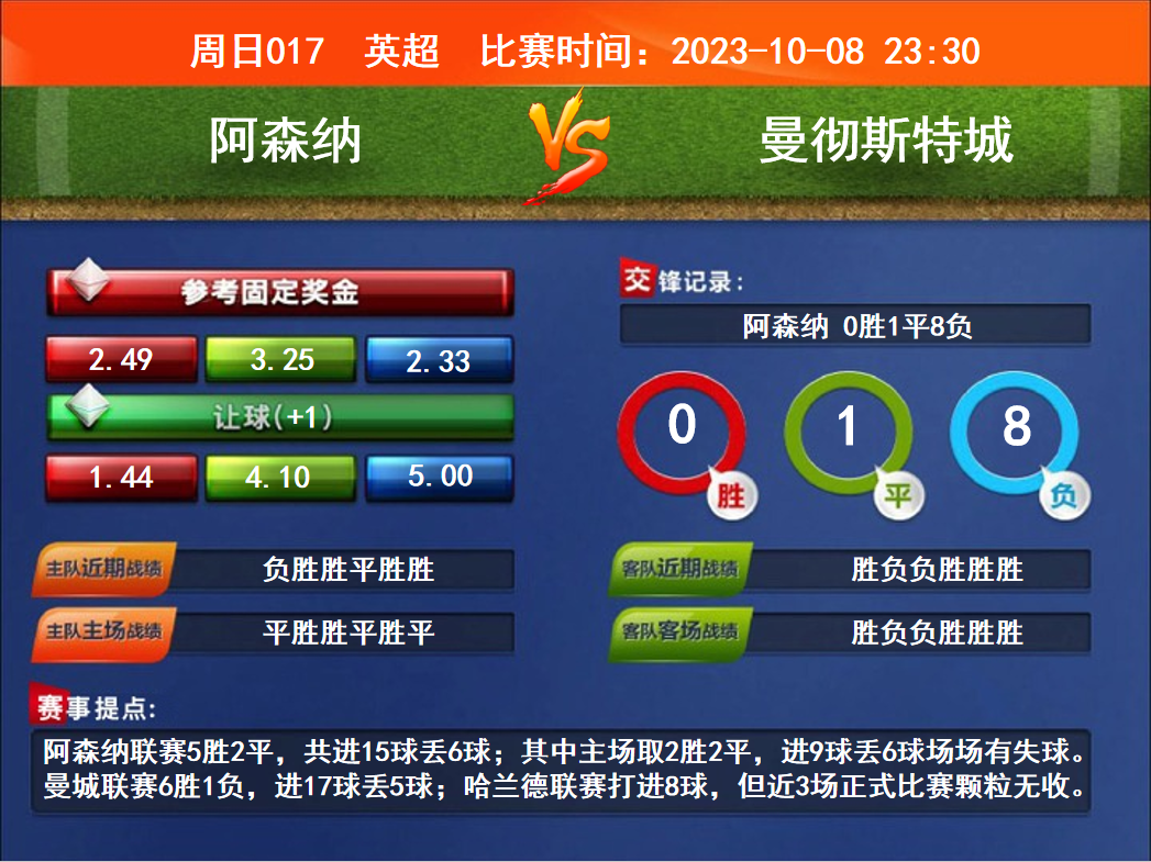 比賽時間:2023-10-08 23:30賽事提點:阿森納聯賽5勝2平,共進15球丟6球;其中主場取2勝2平,進9球丟6球場場有失球。曼城聯賽6勝1負,進17球丟5球;哈蘭德聯賽打進8球,但近3場正式比賽顆粒無收。