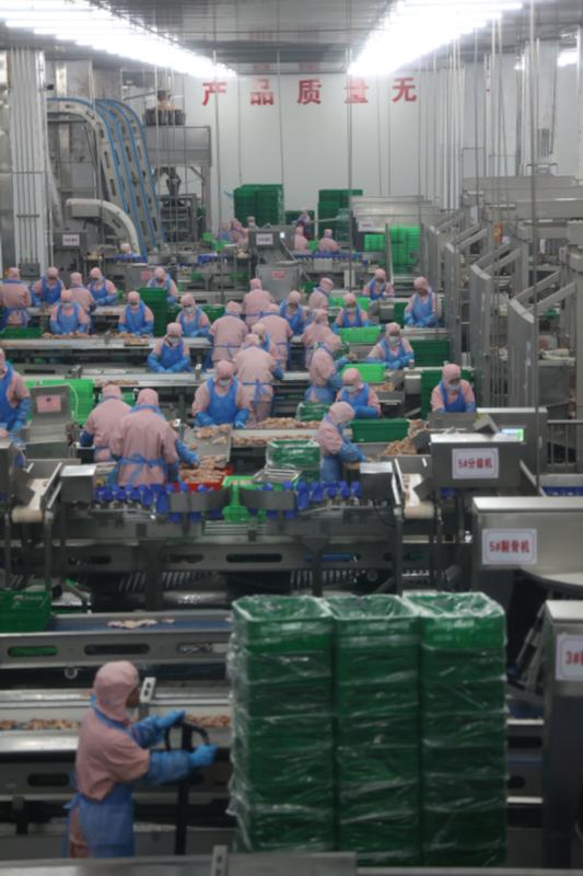 宰殺廠房的燈光比掛雞處的更暗了,除了星星點點的監控燈光,幾乎看不到白羽活雞的運動軌跡。僅僅一步之遙,進入打毛間和掏膛間,白羽雞進行退毛,去頭和去爪后,等待清潔預冷和被精準分割為雞腿、雞翅、雞胸肉等產品。