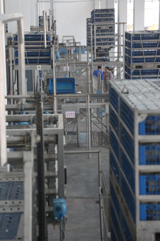 宰雞第一步先消毒,一筐筐自動分好的白羽活雞上架后即得到沖洗,“干干凈凈”地進入下一程序——掛雞。步驟與步驟銜接中的自動化程度很高,掛雞室光線略暗。“我們采用國際化標準,宰殺環節在暗室進行。”相關人員說。