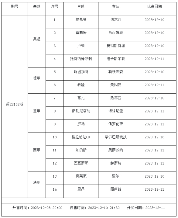 足球彩票勝負游戲(14場和任選9場)第23163期賽程: