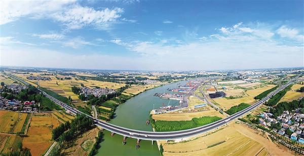 5月27日,周口港中心港區在碧水、藍天、白云、金色麥浪、秀美村莊的映襯下,顯得十分壯美。近年來,我市利用水陸交通優勢,加快構建“鐵公機水”多式聯運體系,努力從“經濟通道”邁向“通道經濟”。