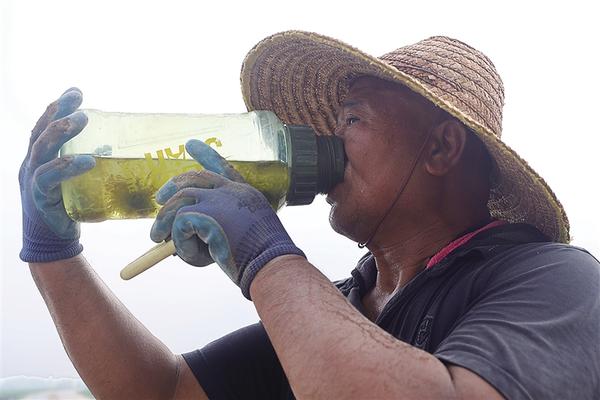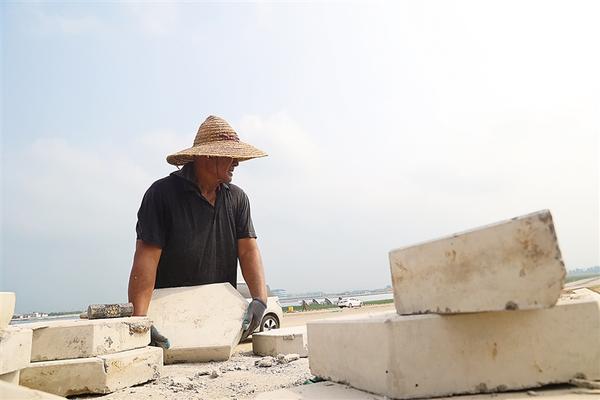 驕陽似火,炙烤著大地。7月16日上午,記者在周口中心城區建設大道東延工程新運河大橋施工現場看到,建筑工人頭頂烈日、揮汗如雨,在做好防暑降溫工作和確保自身安全的情況下有序開展護堤維修作業。記者 劉俊濤 攝