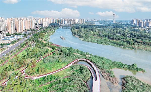 波光粼粼的河面、構思巧妙的景觀游園,市民漫步在沙潁河城區段兩岸濱河公園里,抬眼花木蔥蘢,遠眺如詩如畫,健身步道、親水觀景臺,一步一景讓人陶醉。(記者 李瑞才 攝)