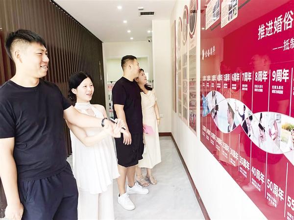 近年來,沈丘縣加大精神文明建設力度,通過舉辦文化大講堂等活動,在廣大群眾中形成“天價彩禮不可取,鋪張浪費最可恥,陳規陋習危害大”的共識,許多年輕人在耳濡目染中受到熏陶,新事新辦蔚然成風。圖為8月29日,農歷七月初七,結婚登記的新人在婚史展板前駐足。