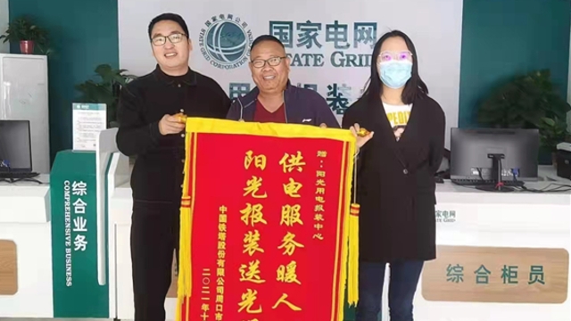 近日,在國網(wǎng)周口供電公司陽光報(bào)裝中心,中國鐵塔股份有限公司周口分公司業(yè)務(wù)經(jīng)理朱義嶺一邊將印有“供電服務(wù)暖人心 陽光報(bào)裝送光明”的錦旗遞給供電工作人員,一邊感謝該公司對(duì)鐵塔基站建設(shè)提供的支持。