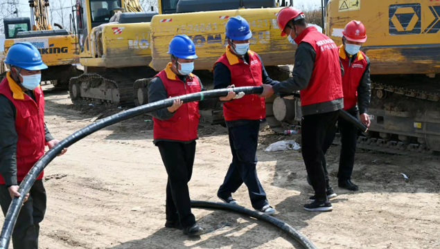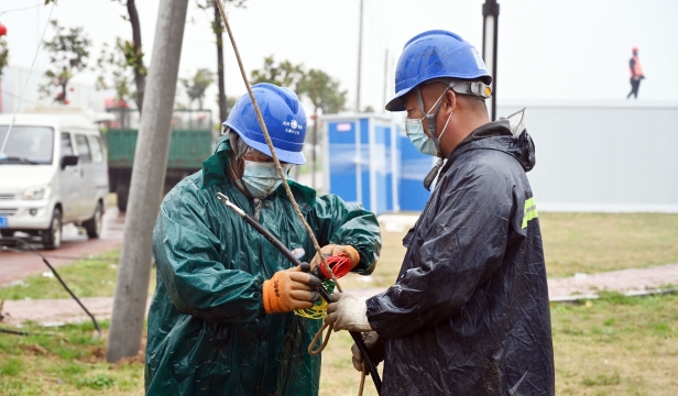 3月25日,在太康縣北環(huán)路核酸檢測方艙和隔離方艙建設現(xiàn)場,國網(wǎng)太康縣供電公司工作人員正冒雨施工為其提供電力保障。