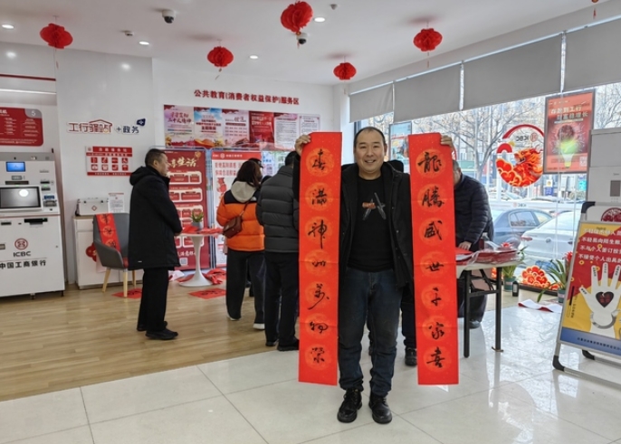 新春佳節(jié)來臨之際,工行周口分行傳承中華民族習(xí)俗,積極營造歡樂祥和吉慶的節(jié)日氛圍,精心組織本行書法家和書法愛好者在營業(yè)網(wǎng)點(diǎn)開展“寫春聯(lián)送福字賀新年”活動(dòng),為廣大群眾送上新春美好祝福。