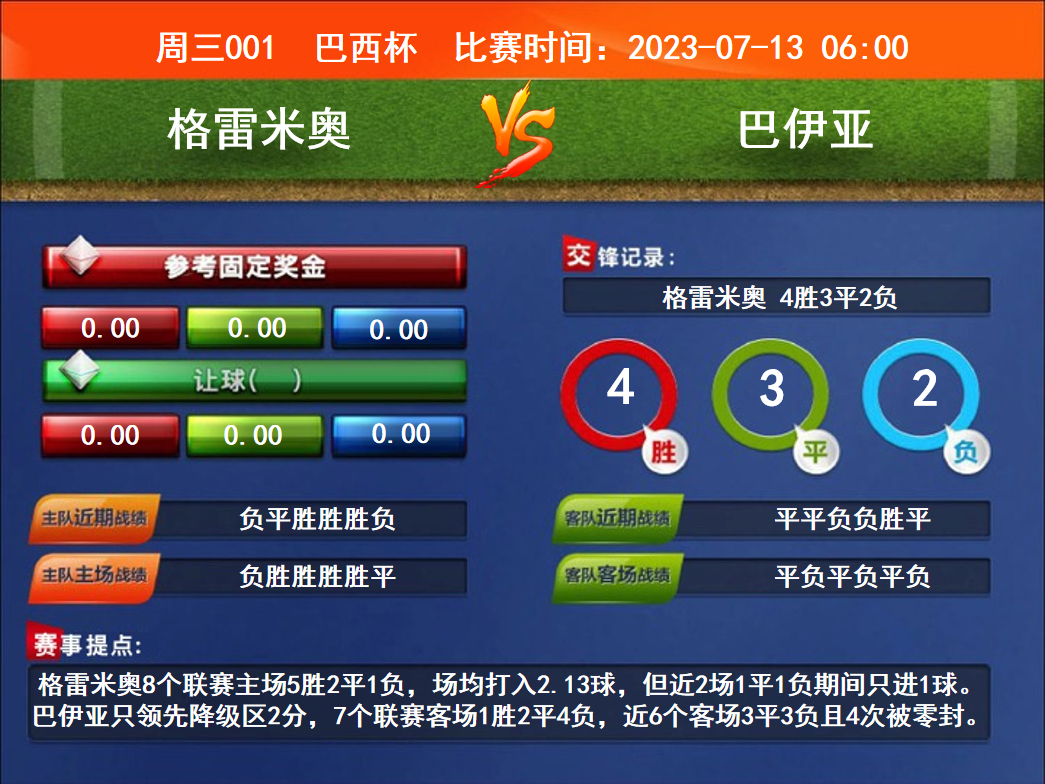 周三競彩足球強檔:格雷米奧勝率不俗 圣何塞5戰不勝