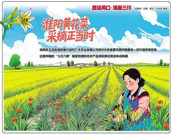 夏至時節,淮陽區王店街道祝寨行政村廣豐農業發展公司的 800 余畝黃花菜種植基地里一派忙碌采摘景象,這里種植的“七芯六瓣” 國家地理標志農產品淮陽黃花菜迎來成熟期,綠葉、黃花和身著工裝的采摘人員成為田地里一道亮麗的風景線。