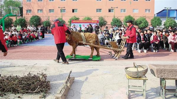 12月5日上午,在項(xiàng)城市人民路小學(xué),項(xiàng)城市德高民俗博物館志愿者將傳統(tǒng)農(nóng)具當(dāng)作教具,向師生講解拖車、犁、耙、耬等農(nóng)具的結(jié)構(gòu)、起源、發(fā)展、應(yīng)用等。