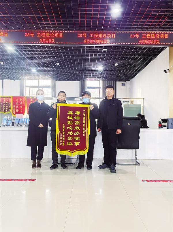 近日,太康縣某置業公司相關負責人將一面印有“廉潔高效辦實事 真誠貼心為企業”字樣的錦旗送到縣自然資源局,感謝工作人員為他們提供優質、高效、熱情的服務。