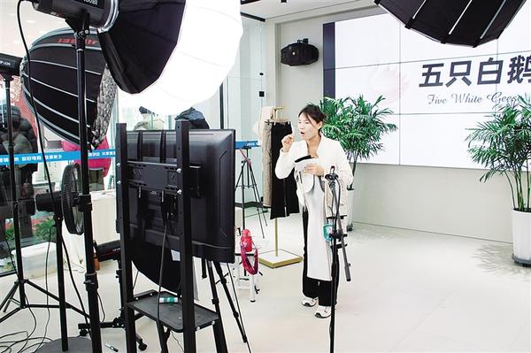 近日,在太康縣返鄉(xiāng)創(chuàng)業(yè)服飾產業(yè)園,一家服裝企業(yè)的工作人員通過網絡直播的形式售賣服裝。