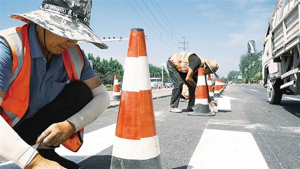 連日來,西華縣華興大道、中原路升級改造項目建設如火如荼。項目完工后,將進一步提升道路通行能力,助力城市“顏值”與品質雙升級。圖為工人在施工現場固定反光錐。