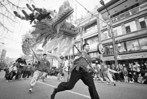 ▲2月22日, 在加拿大溫哥華, 巡游隊伍在春節狂歡游行中表演舞龍。當日,溫哥華唐人街舉行第42屆春節大游行,本年游行的隊伍多達80支,參加表演人數超過4000人,規模是歷屆之最。游行共吸引近10萬人沿途觀看。