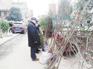 上圖 昨日上午,一位市民正在挑選果樹。又是一年春來到,眾多市民紛紛趁早春時節(jié)種植樹木。