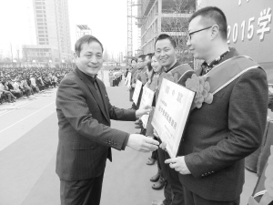3月8日上午,淮陽一高萬余名師生在學校操場隆重舉行新學期表彰大會。大會回顧了2014~2015學年第一學期的各項工作,對感動校園學生、優秀班主任、優秀員工、優質課教師等24個項目近500人次進行了表彰。淮陽縣有關領導及淮陽一高全體師生參加了本次表彰大會。圖為王業生校長為獲獎人員頒發獎狀。(豆紀鋒 攝)